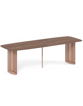 Der Tisch ARDIA begeistert mit seiner architektonischen Form: Eine ovale Tischplatte ruht scheinbar schwebend auf zwei filigranen, durchbrochenen Beinen. Deren rhythmische Konstruktion erinnert an Licht, das durch Baumkronen fällt, oder an sanfte Spiegelungen auf einer Wasseroberfläche. Das Ergebnis ist eine harmonische Verbindung aus Leichtigkeit und Stabilität, die dem Raum Offenheit, Ruhe und subtile Dynamik verleiht.