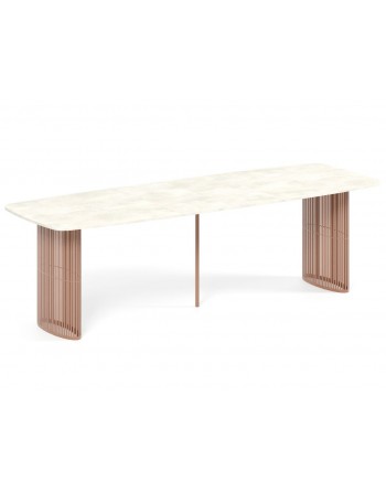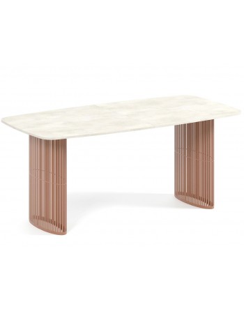 Ausziehbarer Tisch 180 cm lang, auf weißem Gestell. Esstisch. Moderner Tisch. Tisch auf einem kupfernen Lamellenrahmen.