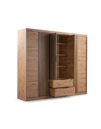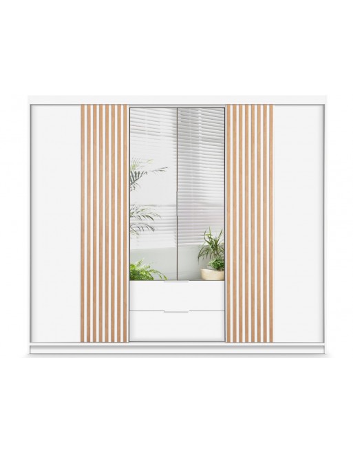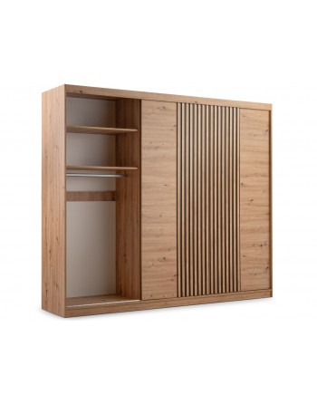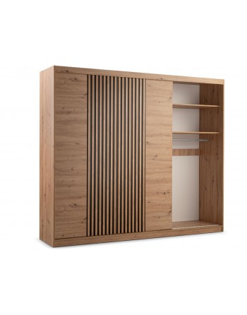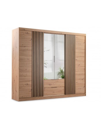 Der 250 cm große Schiebetürenschrank mit Spiegel MAJORKA ist ein modernes Möbelstück, das für die anspruchsvollsten Kunden entwickelt wurde. Ein geräumiger Kleiderschrank ist für Menschen gedacht, die drei Schlüsselwerte von Möbeln schätzen: Funktionalität, Kapazität und Zweckmäßigkeit. Ein geräumiger Kleiderschrank, der in drei Teile unterteilt ist. Rechts und links am Kleiderschrank befinden sich Schiebetüren mit Lamellenfront, die den modernen Stil unterstreichen. Der Innenraum des Kleiderschranks verfügt hinter den Schiebefronten über zwei Einlegeböden oben und eine Stange unten. Hinter der Spiegelfront befinden sich 3 Einlegeböden (4 Stellplätze). Im Mittelteil des Kleiderschranks befinden sich zwei Klappfronten mit Spiegel und zwei geräumige Schubladen.