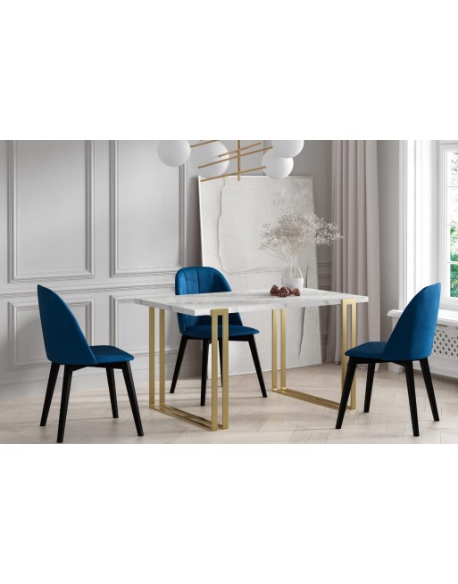 Suchen Sie einen rechteckigen ausziehbaren Tisch für das Wohnzimmer? Dann ist der rechteckige ausziehbare Tisch 140/240x80 genau das Richtige für Sie. Wunderschöne Marmorplatte und Tischbeine aus gold pulverbeschichtetem Stahl. Dieser moderne rechteckige Tisch ist die perfekte Wahl für die Küche oder das Wohnzimmer. Die Tischplatte besteht aus laminierter Platte, die weißen Marmor imitiert, was ihr ein elegantes Aussehen verleiht.Der Tisch TERINI passt perfekt in moderne Innenräume und verleiht ihm Eleganz und Stil. Dank seiner Abmessungen und der Möglichkeit der Entfaltung ist es ein idealer Ort für Familienessen und Treffen mit Freunden.Die Tischplatte hat die Maße 140 x 80 cm und ist im ausgeklappten Zustand 220 cm lang, sodass mehr Personen an dem Tisch Platz nehmen können. Die Tischplatte ist ca. 3,6 cm dick, was ihr eine solide Struktur und Haltbarkeit verleiht.Das Tischgestell besteht aus goldfarbenem Stahl.